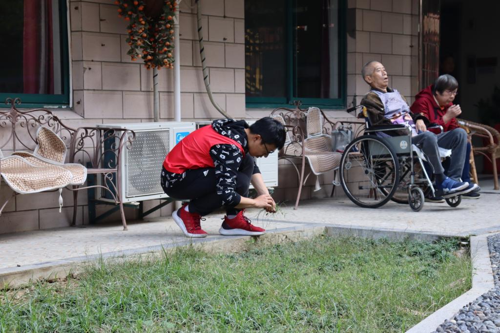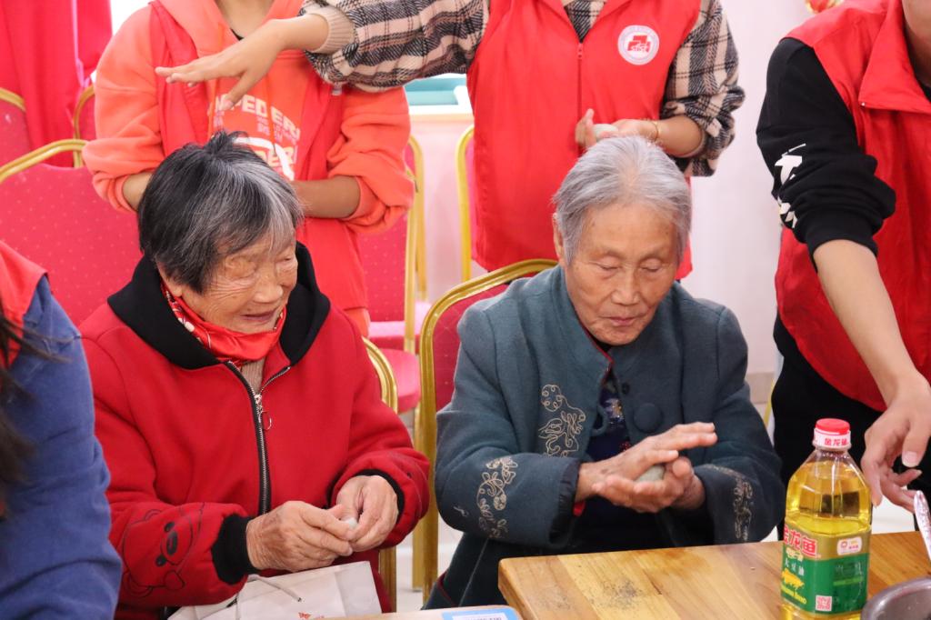 同学们帮助敬老院工作人员打扫卫生,除了室内的环境,还在室外除草。在立冬到来之际,还和老人们一起制作青团,大家一起揉粉、和面、炒馅儿,围在一起包青团,同学们陪着老人交流谈心,有说有笑,分工合作。在蒸制的时间里,他们还为老人们带来了才艺表演,并给老人赠送了自制的香囊,度过了意义非凡的一天。