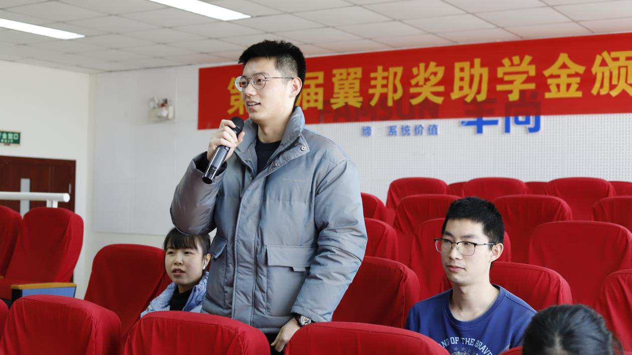 随后,欧锦强代表公司致辞。他阐述了翼邦成立奖学金的初衷,并表达了对优秀同学们的期望与期许。人力资源经理严瑶宣读获奖名单,校企双方嘉宾共同为获奖同学颁发证书。一等奖获得者任海东作为学生代表发言。他表示感谢翼邦公司,感谢食品学院搭建的优秀平台,今后,他将铭记教导,践行“江南食品人,敢为天下先”的精神,不断开拓进取,披襟斩棘,为食品强国梦而奋斗不息!