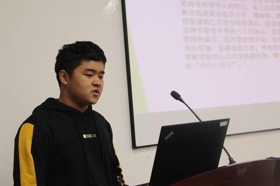 第二组钟子鹏同学简单介绍了电影《谭嗣同》,展示了早期维新派成员故居的照片,并传达出了对理想与信念的追求和克服困难的决心。