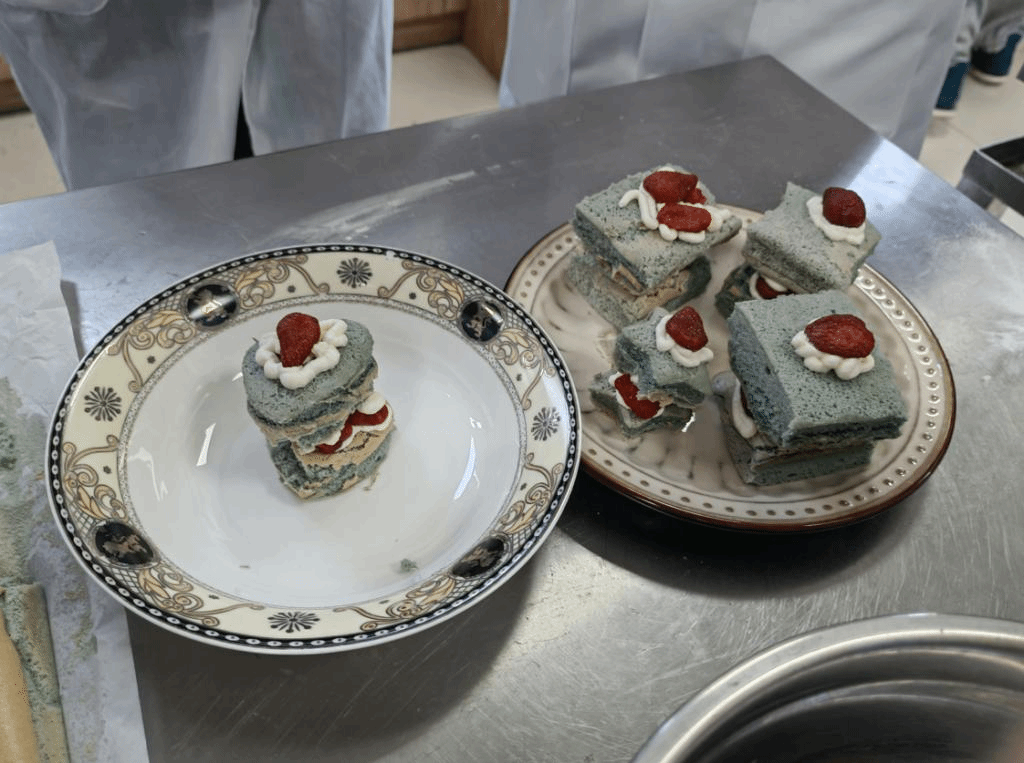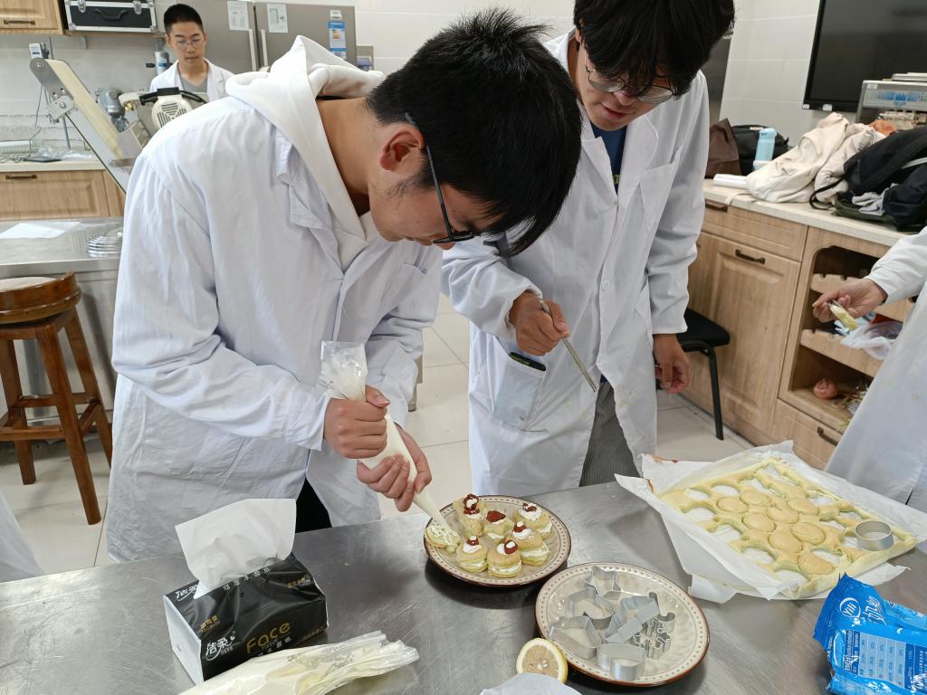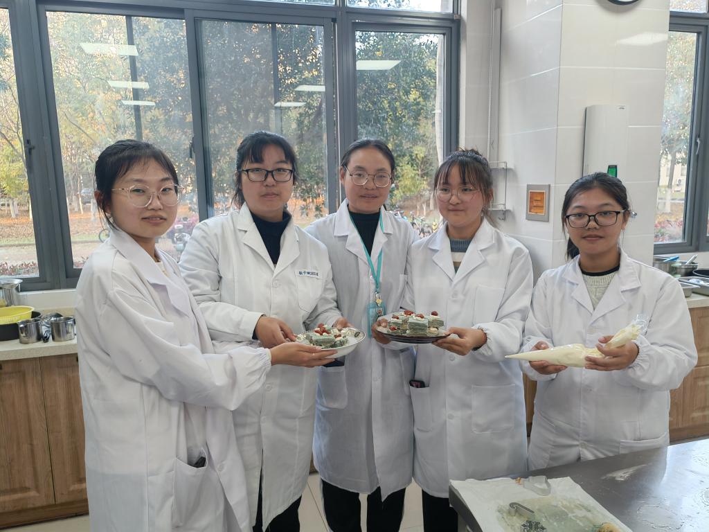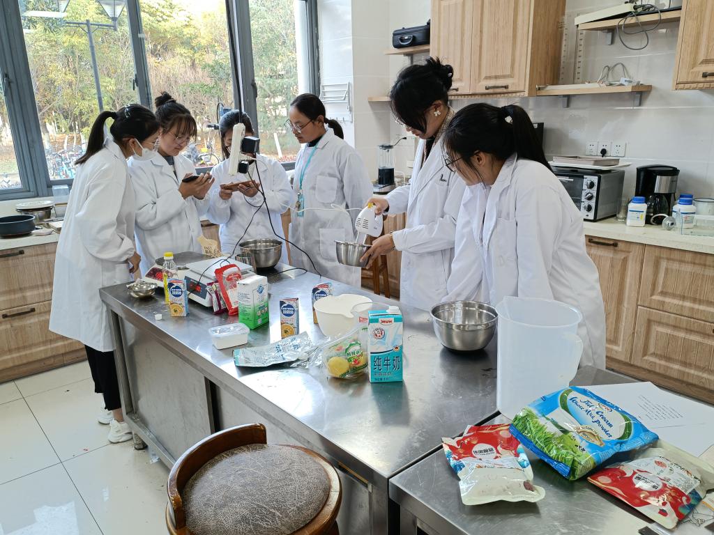 在乳制品俱乐部负责同学的讲解和带领下,同学们逐步完成蛋糕胚和奶酪馅等制作环节,并在制作结束后品尝了自己亲手制作的草莓西域小贝蛋糕。