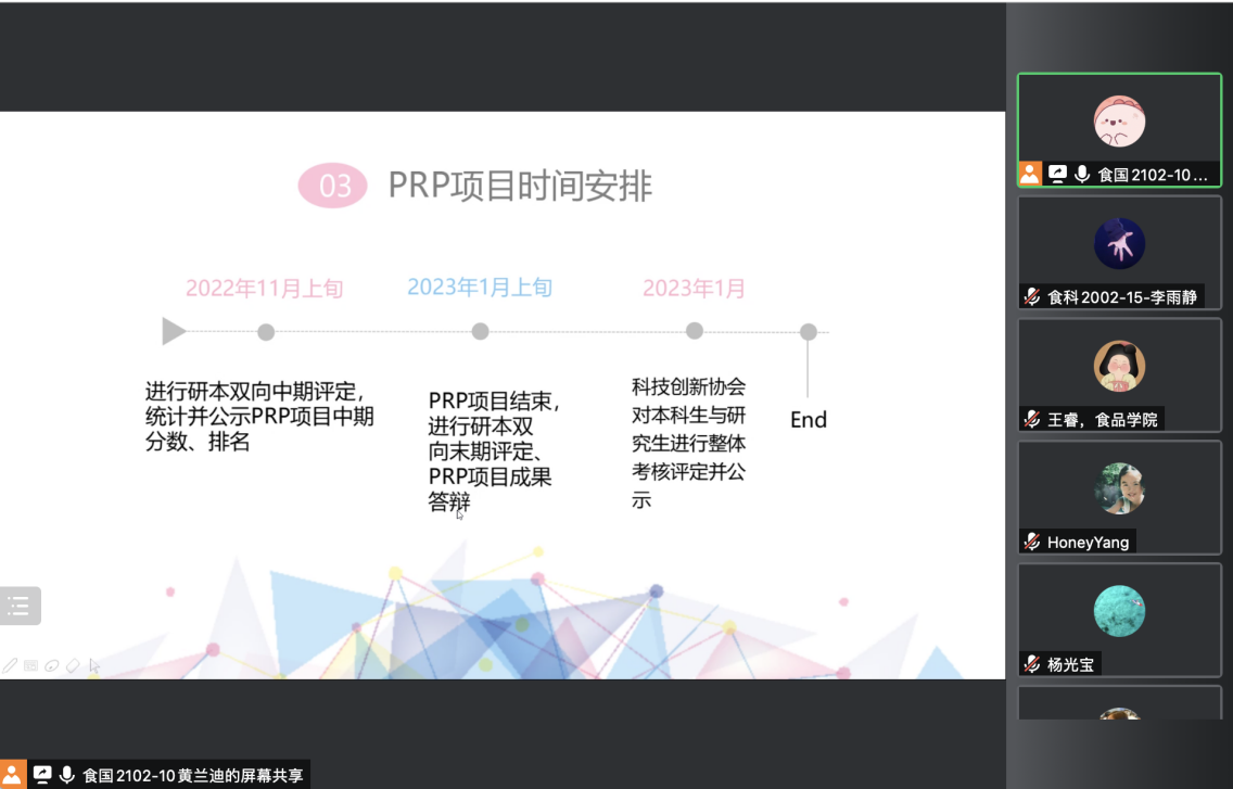 2022年6月2日晚,2021级PRP项目宣讲会在线上成功举行。食品学院竞赛辅导员杨光宝、2021级本科生辅导员张任,部分往届PRP项目代表,以及全体2021级本科参与活动。