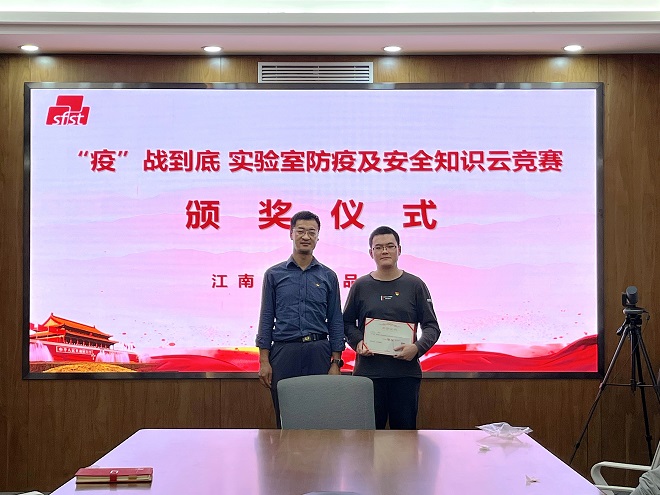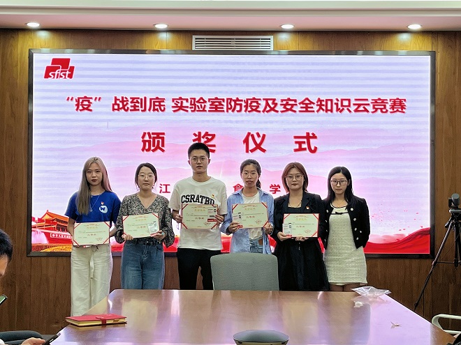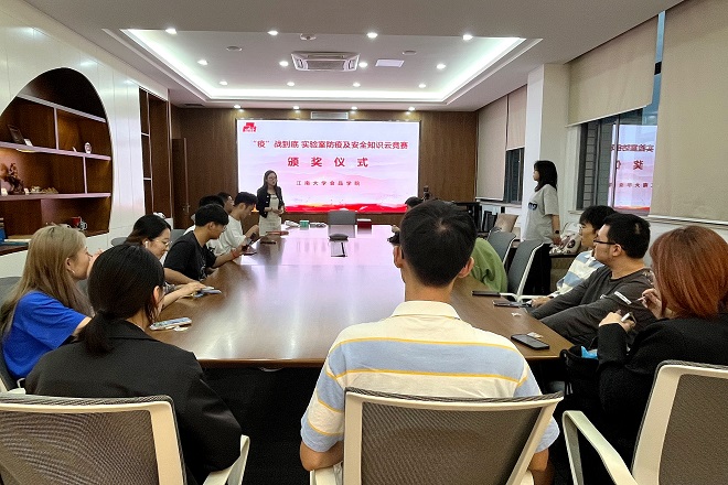 9月21日晚,由食品学院主办的“疫”战到底—实验室防疫及安全知识云竞赛活动圆满结束。活动共评选出一等奖1名,二等奖3名,三等奖5名和优秀奖5名。颁奖仪式上,学院实验室主任王文龙、党委专职组织员王胤、研究生辅导员胡卉君、谷物与淀粉工程研究中心博士党支部书记尤钰娴分别为获奖学生颁发证书及奖品,并再次强调了疫情常态化防控形势下,实验室安全教育的重要意义。