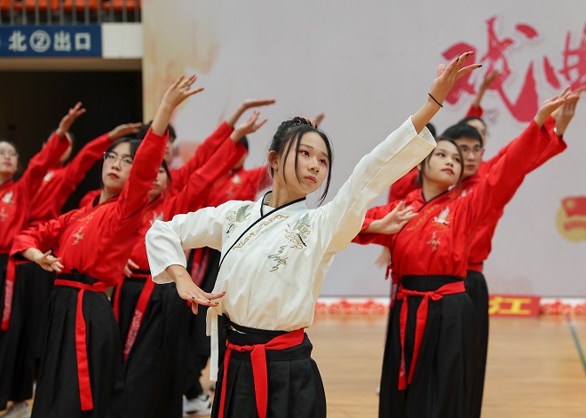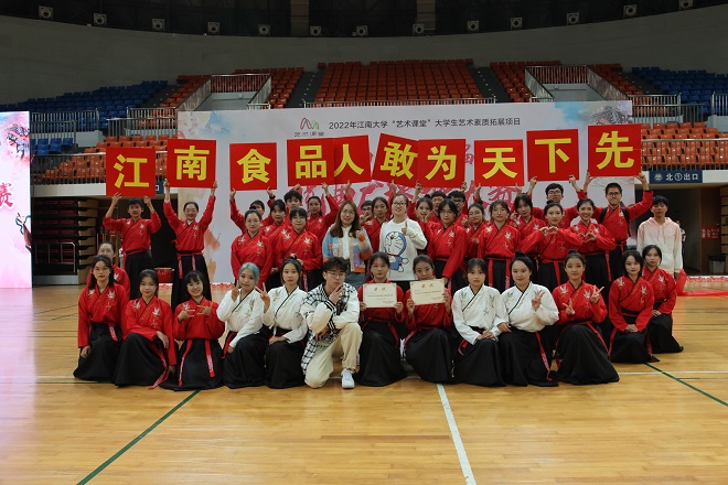 本次比赛中,食品学院的选手们入场井然有序,动作整齐划一,或长袖飘飖、裙袂生风;或蛾眉轻敛、素手成拳,食品学子在比赛中精神饱满、动作整齐划一,赢得了在场观众的阵阵掌声。表演最后,我院参赛选手打出“江南食品人,敢为先下先”的标语,展现出食品学子朝气蓬勃的青春风采。