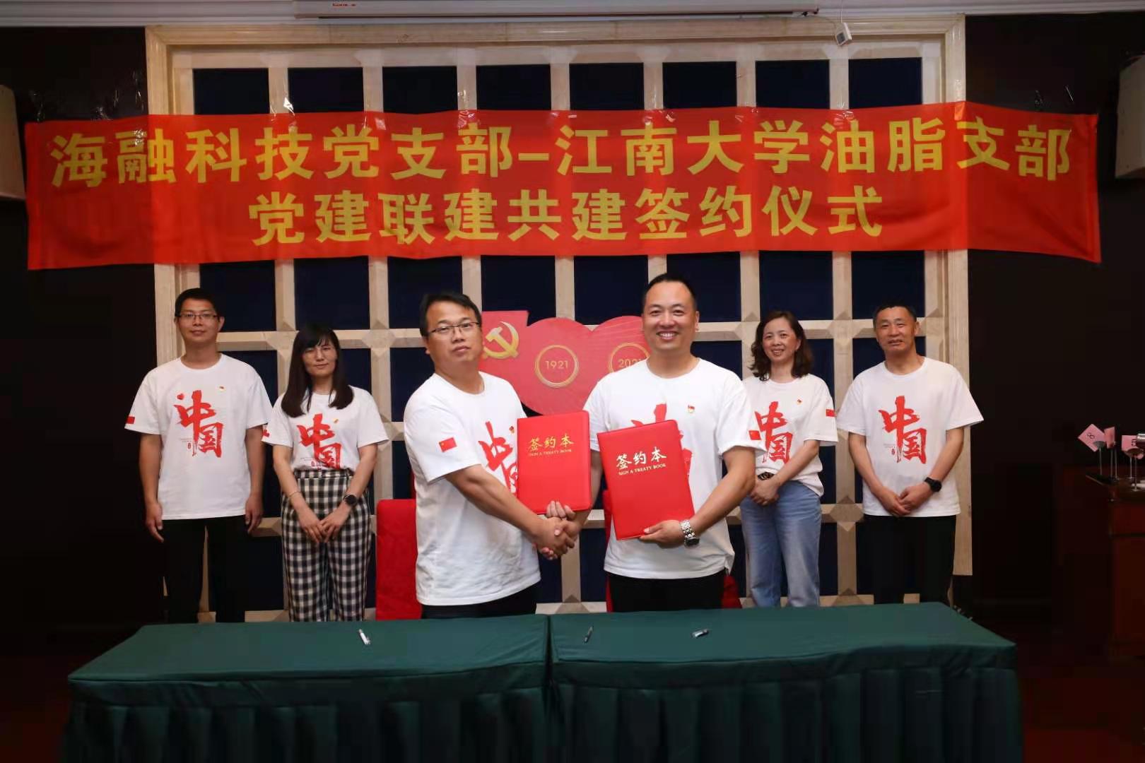 最后,海融科技党支部和食品学院油脂与植物蛋白工程研究中心教师党支部开展党建联建共建协议签约仪式。仪式上,海融科技党支部书记叶金郁同志就海融食品科技有限公司党建工作、廉政建设、校企合作以及业务发展等方面进行了简要介绍。油脂与植物蛋白研究中心教师党支部书记徐勇将同志围绕党建成果、学科建设、团队研究、合作交流等方面,介绍了食品学院油脂与植物蛋白工程研究中心党支部和脂质营养健康与绿色制造创新团队近年来的党建与科技研究成果。双方表示,今后将在党建工作的引领下,在党史学习教育、科技创新、人才培养等方面开展深入的合作交流,力求达到以岗带动、结对互促、双向发展、共同提高的效果。