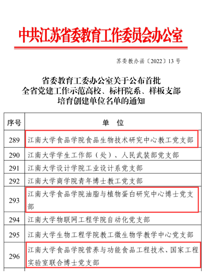 近日,江苏省委教育工委公布了首批全省党建工作示范高校、标杆院系、样板支部培育创建单位名单,我院食品生物技术研究中心教工党支部、油脂与植物蛋白研究中心博士党支部,营养与功能食品工程技术、国家工程实验室联合博士党支部入选“首批全省党建工作样板支部”培育创建单位。
