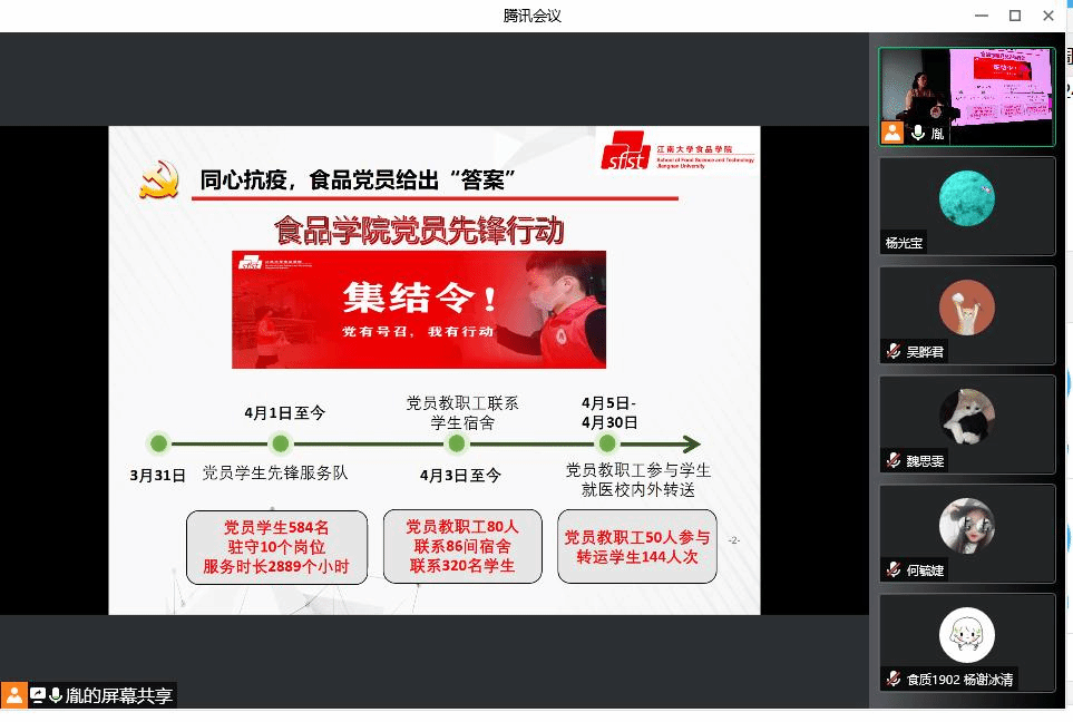 食品学院党委书记傅莉莉首先对4月以来师生党员在疫情防控工作中勇于亮身份、当先锋、做表率,以多种方式积极发挥作用的表现给予充分肯定,并对近期党支部工作进行了部署,对下一步党建工作规范化提出了要求。
