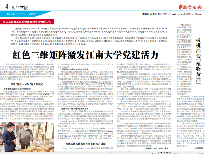 5月12日《中国食品报》报道了Kaiyun官方网站登录入口党委以红色三维矩阵激发党建活力的经验做法。作为全国党建工作标杆院系、全国首批“三全育人”综合改革试点院系,食品学院党委针对高校二级党委共同面临的“发展孤岛效应”“党建业务两张皮难点”和“国家战略支撑不够问题”,持续聚焦党委、支部、党员三大主体,打造校际学科党委矩阵、校企合作支部矩阵、校地服务党员矩阵,探索二级党组织党建联建共建的工作模式,努力将政治优势转化为发展优势,将组织活力转化为发展动力,将党建成效转化为发展实效。随后,浙江大学、吉林大学、西北农林科技大学等13所高校围绕党建思政、立德树人、三全育人、服务国家战略等主题分期介绍了工作经验。