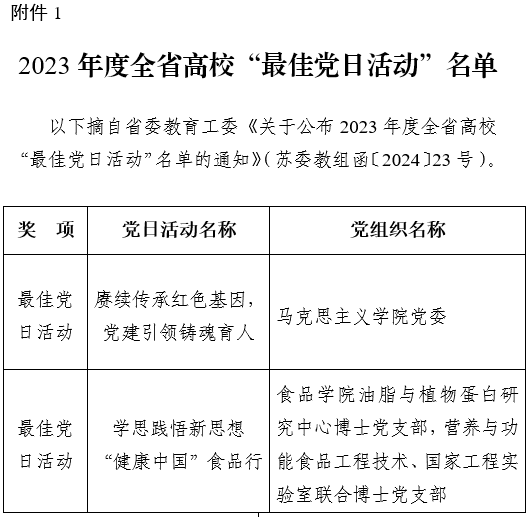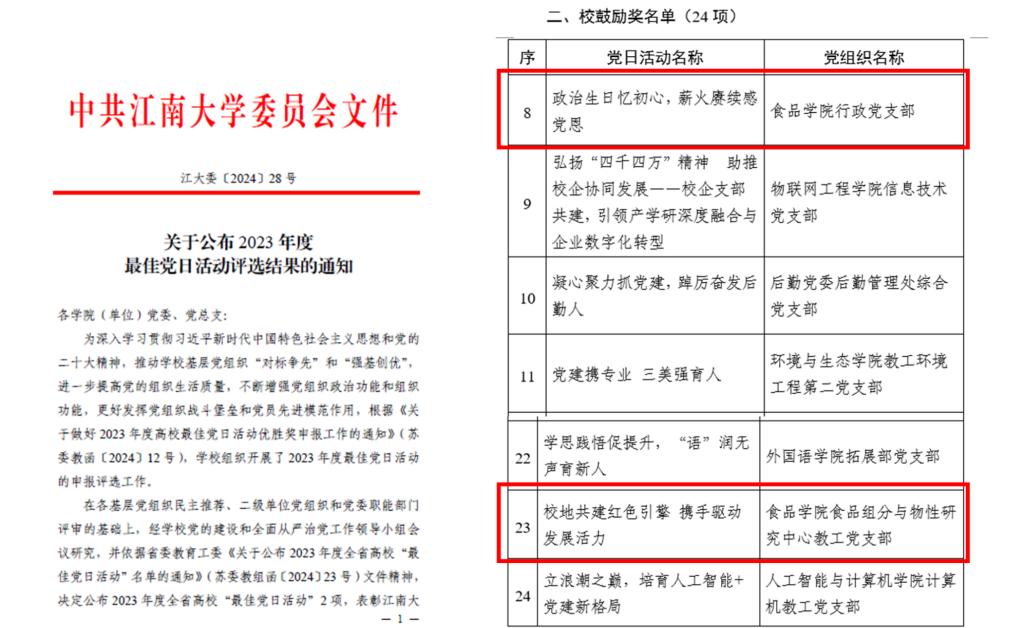 近日,江苏省委教育工委公布2023年度全省高校“最佳党日活动”评选结果,学校党委公布2023年度江南大学最佳党日活动获奖名单。食品学院油脂与植物蛋白研究中心博士党支部,营养与功能食品工程技术、国家工程实验室联合博士党支部联合主题党日活动获2023年度全省高校“最佳党日活动”;食品学院行政党支部、食品组分与物性研究中心教工党支部获江南大学最佳党日活动鼓励奖。