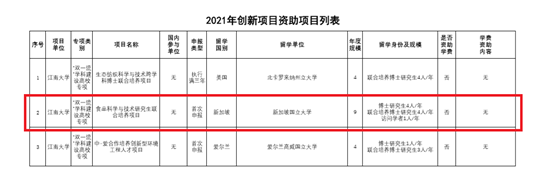 日前,国家留学基金管理委员会公布了2021年创新型人才国际合作培养项目(以下简称“创新人才培养项目”)获批清单,我院“食品科学与技术研究生联合培养项目”成功入选。项目负责人为我院副院长谢云飞教授,外方院校是新加坡国立大学,这是我院继2020年以来连续两年获批国家留学基金委创新人才项目。项目执行期限为三年,这将为我院研究生新增27名公派名额,为研究生搭建了高层次海外交流渠道,显著提升学院与世界一流大学机构在国际化人才培养、科学研究方面的联合力度。