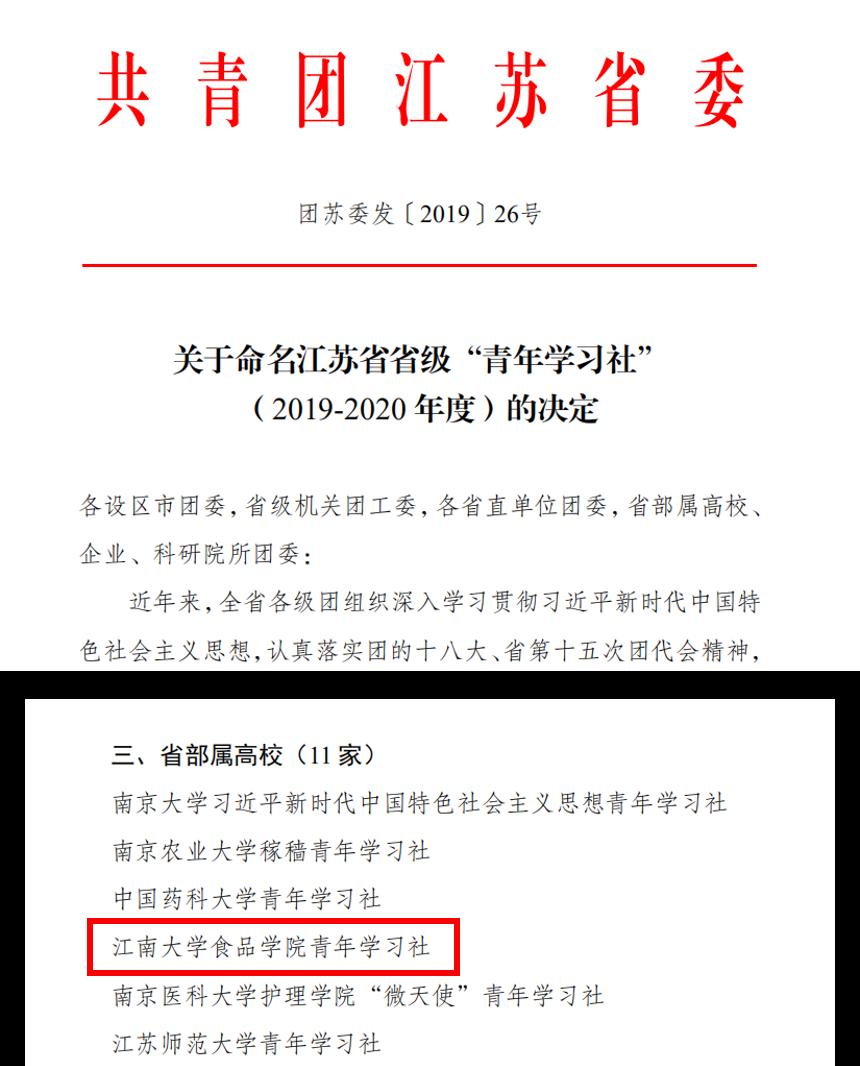 近日,从江苏团省委传来消息,经过材料评审、现场答辩,食品学院青年学习社获评江苏省省级“青年学习社”(2019-2020年度),本次获评的学习社全省50家,其中包括南京大学、南京农业大学等11家高校。