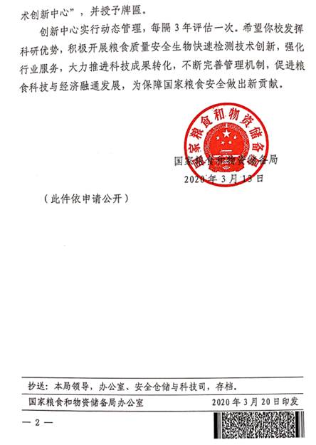 近日,国家粮食和物资储备局发布了《国家粮食和物资储备局关于命名授牌国家粮食质量安全生物快速检测技术创新中心的通知》。根据相关规定,经组织专家现场考察和会议论证研究,原则同意我校建设“国家粮食质量安全生物快速检测技术创新中心”,并授予牌匾。