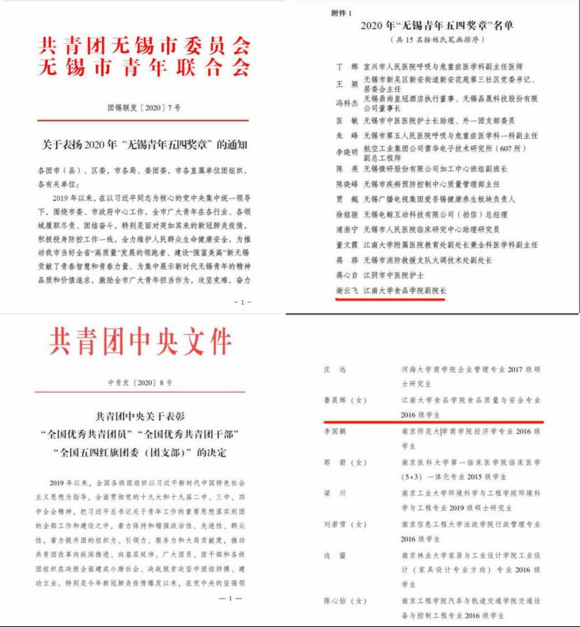 食品学院谢云飞副院长获评“无锡五四青年奖章”,鲁晨辉获评“全国优秀共青团员”