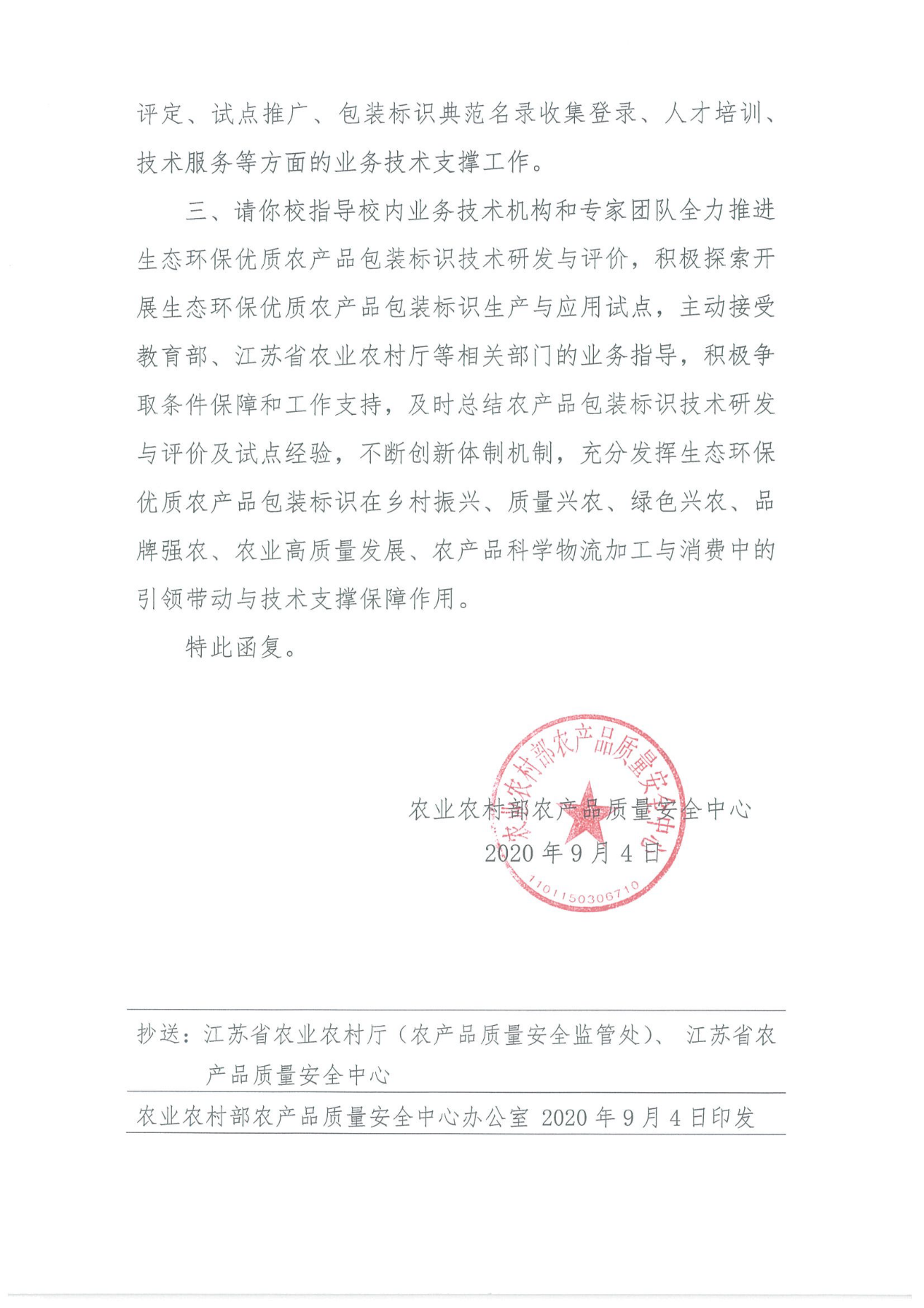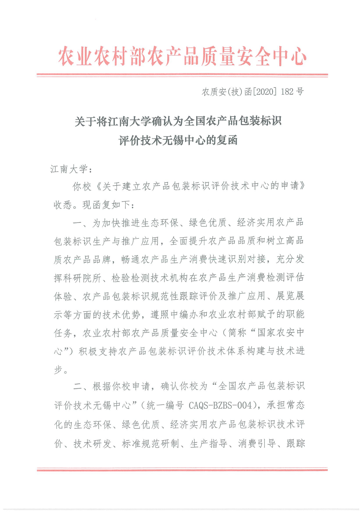 近日,接农业农村部农产品质量安全中心《关于将江南大学确认为全国农产品包装标识评价技术无锡中心的复函》(农质安(技)函[2020]182号),我校获批“全国农产品包装标识评价技术无锡中心”(统一编号CAQS-BZBS-004),成为全国第四个农产品包装标识评价技术中心。