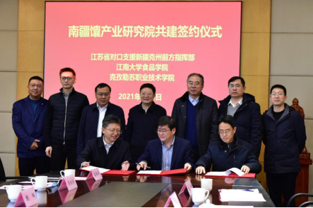 2021年2月3日上午,南疆馕产业研究院共建签约仪式在我院隆重举行。江苏省对口支援新疆克州前方指挥部党委书记周伟文、党委副书记王晓东,新疆阿合奇县县委常委、副县长李桂林、县委组织部副部长秦向军,新疆克孜勒苏职业技术学院党委副书记、院长郭江峰,江南大学校长助理张光生、产业技术研究院院长刘龙、食品学院院长刘元法、食品学院副院长王立等代表参加了签约仪式。