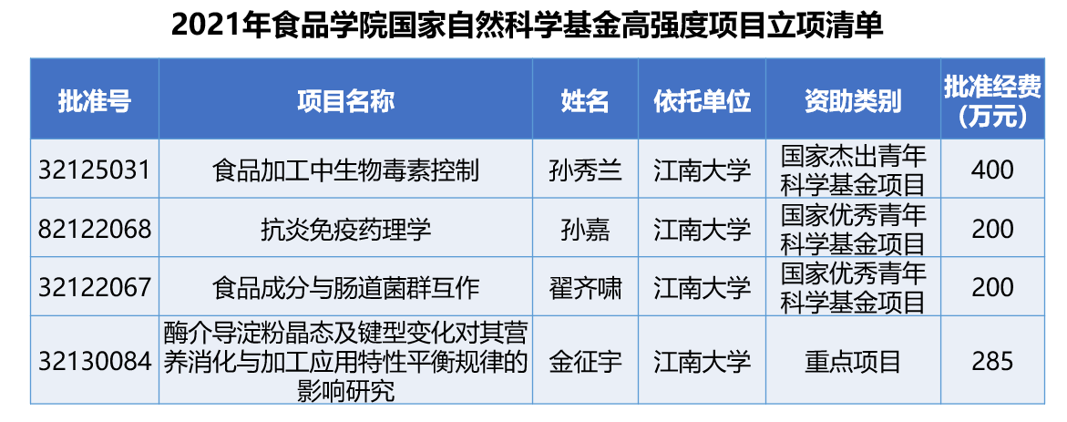 近日,国家自然科学基金委员会公布了首批2021年国家自然科学基金申请项目评审结果。食品学院共获各类项目资助29项,其中面上项目15项,青年项目10项,杰青1项,优青2项,重点项目1项,资助总经费2179万元,立项率达29%(全国平均立项率为16.51%),其中高强度项目立项数及立项总经费创历史新高。