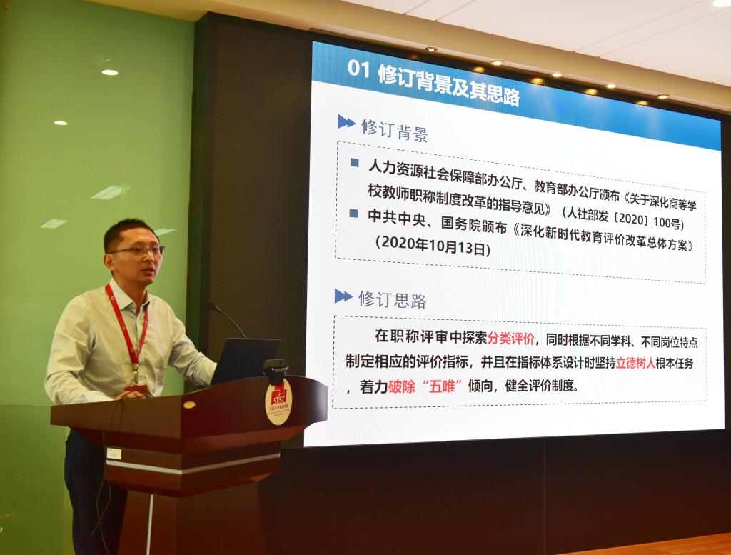 培训的第二个环节,人力资源处副处长陈勇为青年教师解读了学校最新颁布的职称评审相关政策,他介绍了学校认真贯彻落实《深化新时代教育评价改革总体方案》精神,在职称评审中探索分类评价,根据不同学科、不同岗位特点制定相应的评价指标,并且在指标体系设计时坚持立德树人根本任务,着力破除“五唯”倾向,健全评价制度,还现场为青年教师答疑解惑。
