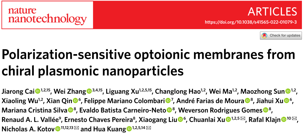 江南大学胥传来教授团队受螳螂虾启发,利用金纳米颗粒自组装排列形成手性纳米膜,实现了圆偏振光的精准区分与识别,研究工作以Polarization-sensitive optoionic membranes from chiral plasmonic nanoparticles为题,于2022年3月14日24时在《自然·纳米技术》(Nature Nanotechnology)期刊上在线发表( https://www.nature.com/articles/s41565-022-01079-3)。
