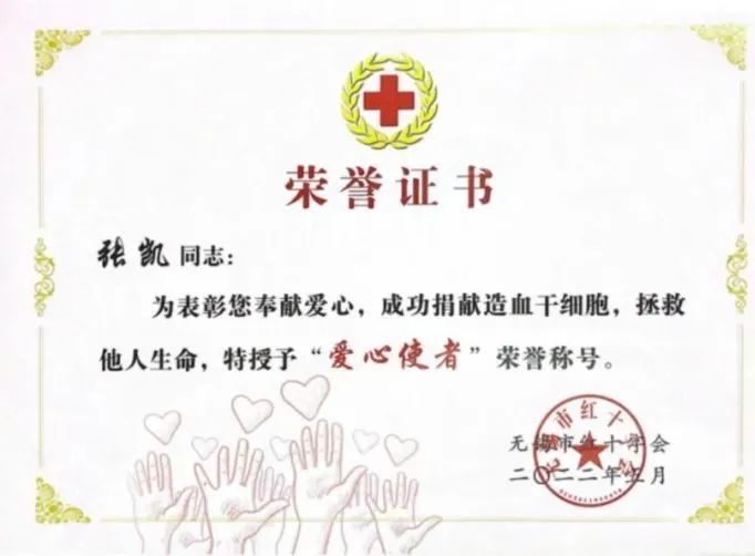 生命至上,大爱髓缘。造血干细胞的捐献移植,连接着一个生命的新生,承载着一个家庭的幸福,传递着无私的关爱和温暖。张凯将“生命的种子”传递给他人,重新燃起孩子即将熄灭的生命之火,用爱心挽救一个家庭,这是勇敢之义举,饱含高尚之大爱。