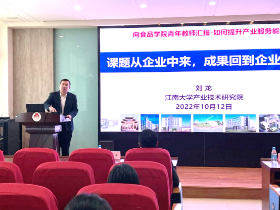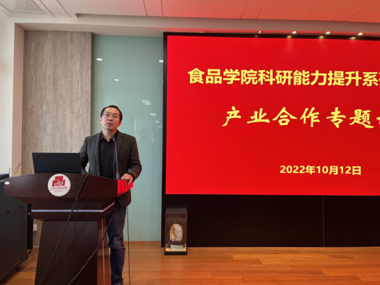 2022年10月13日下午,食品学院“科研能力提升系列活动——产业合作专题讲座”在食品楼D912举行。学院邀请了产业技术研究院院长刘龙教授、食品学院朱科学教授和设计学院吴祐昕教授为青年学者们分享产业合作方面的经验做法。讲座由食品学院程力副院长主持,40余名青年教师和博士后参会交流学习。