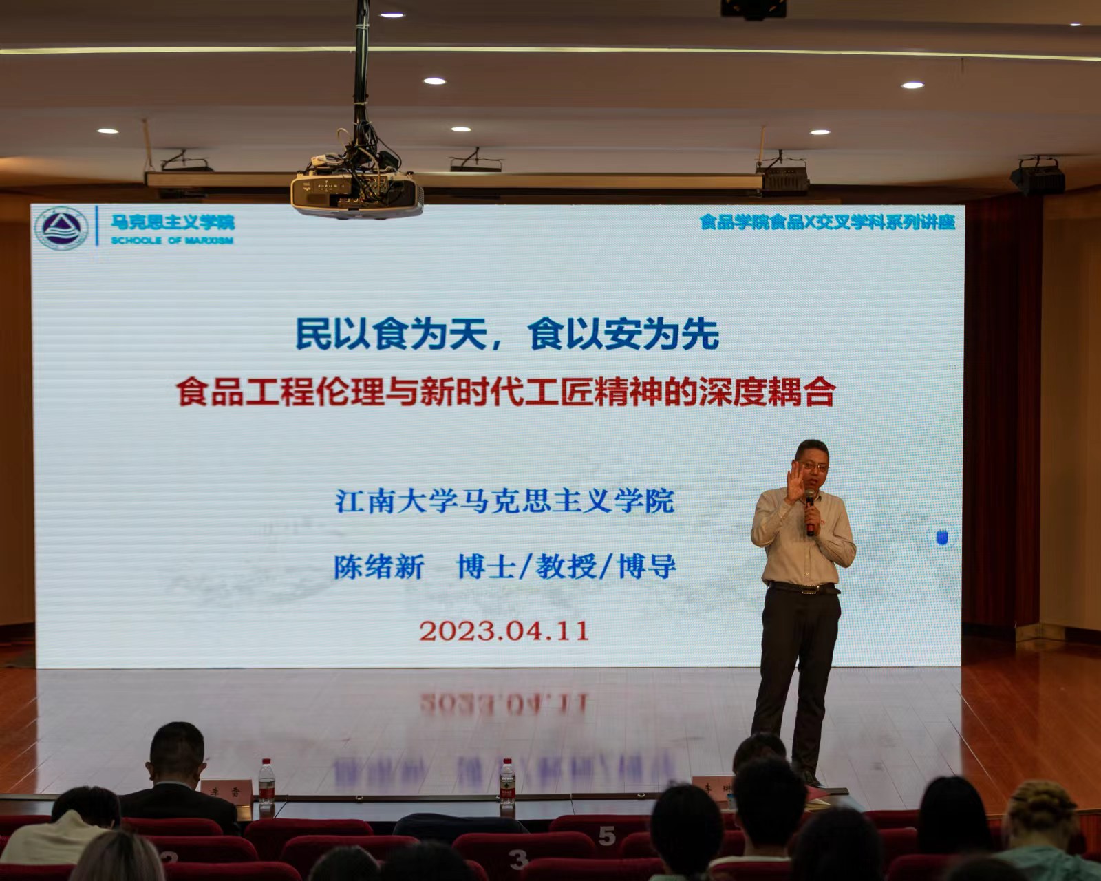 4月11日下午,“食品X”交叉学科系列讲座在北区大学生活动中心再次开讲。本次活动邀请到马克思主义学院博士生导师陈绪新教授作题为《民以食为天,食以安为先——实现食品工程伦理与新时代工匠精神的深度耦合》的报告。食品学院党委副书记、副院长李雷,分团委副书记李琳及380余名食品学子参加活动。2020级本科生辅导员王文燕担任主持。