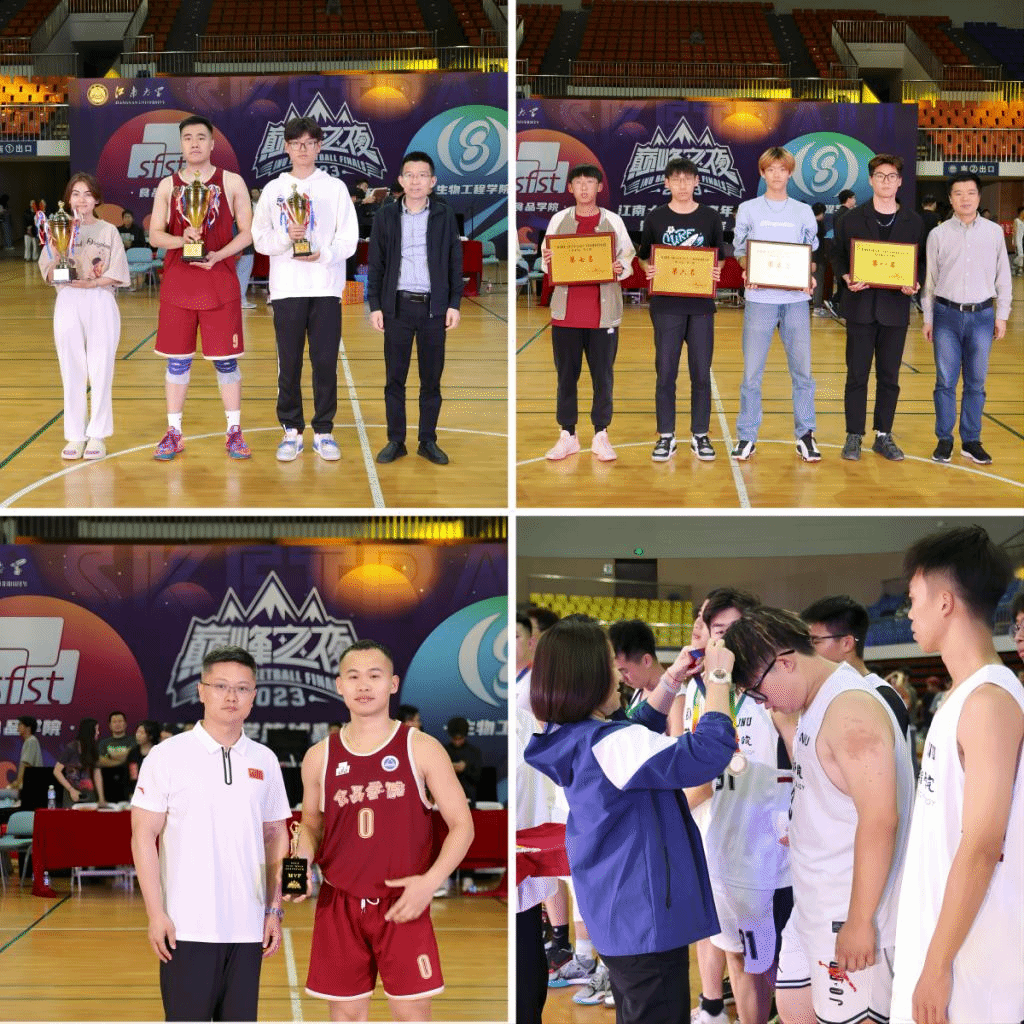 闭幕式上,党委学生工作部部长周伟涛为小学院组男篮获奖球队颁奖;校长办公室主任黄敏为大学院组男篮获奖球队颁奖;体育部主任秦永和为总决赛“最有价值球员”和“三分王”颁奖;生工学院党委书记程捷音为总决赛亚军球队颁奖;食品学院院长范大明为总决赛冠军球队颁奖。