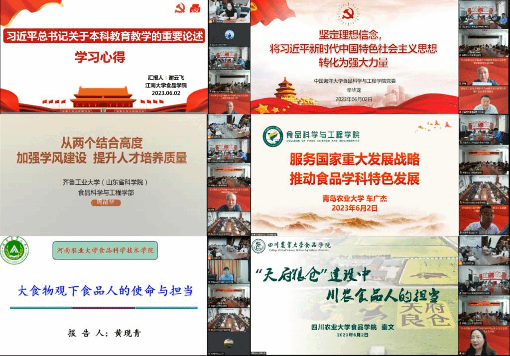 联学活动由Kaiyun官方网站登录入口党委书记、全国高校食品学科党建联盟秘书长傅莉莉主持。Kaiyun官方网站登录入口副院长、教授、博导,教育部国家级高层次青年人才谢云飞以《习近平关于本科教育教学的重要论述》作专题报告。报告围绕重要论述的时代背景、战略意义、思想精髓和重要内容,阐述了党和国家对教育的战略定位,指明了本科教育教学建设方向。中国海洋大学食品科学与工程学院党委书记、教授,《形势与政策课》主讲人辛华龙以《坚定理想信念,将习近平新时代中国特色社会主义思想转化为强大力量》作专题报告。报告结合主题教育和党的二十大对理想信念教育的有关要求,阐述了教育工作者坚定理想信念的重要意义。齐鲁工业大学(山东省科学院)食品科学与工程学部党委书记、副教授周邵华以《从“两个结合”高度加强学风建设提升人才培养质量》作专题报告。报告结合高校人才培养过程中存在的普遍问题,从马克思主义实践性、人民性双重维度分析了“两个结合”的内在逻辑,并强调了要抓好学风建设的重要性。青岛农业大学食品科学与工程学院党委书记、副教授,特种食品研究院副院长车广杰以《服务国家重大发展战略,推动食品学科特色发展》作专题报告。报告分享了学院在联合多元主体开展食品领域协同创新,推动学校食品学科特色发展的生动实践。河南农业大学食品科学技术学院院长、教授、博导,河南省优秀教师黄现青以《大食物观下食品人的使命与担当》作专题报告。报告围绕习近平总书记关于大食物观的重要论述,深刻阐释了“大食物观”的核心要义,指出了食品人要以德为先,强化使命担当。四川农业大学食品学院党委书记、教授、博导,教育部教学指导委员会委员秦文以《“天府粮仓”建设中川农食品人的担当》作专题报告。报告围绕习近平总书记关于“三农”工作重要论述和到川视察重要指示精神,介绍了四川农业大学食品学院在推进学科、人才、团队和科研协同发展方面做出的努力和成果。