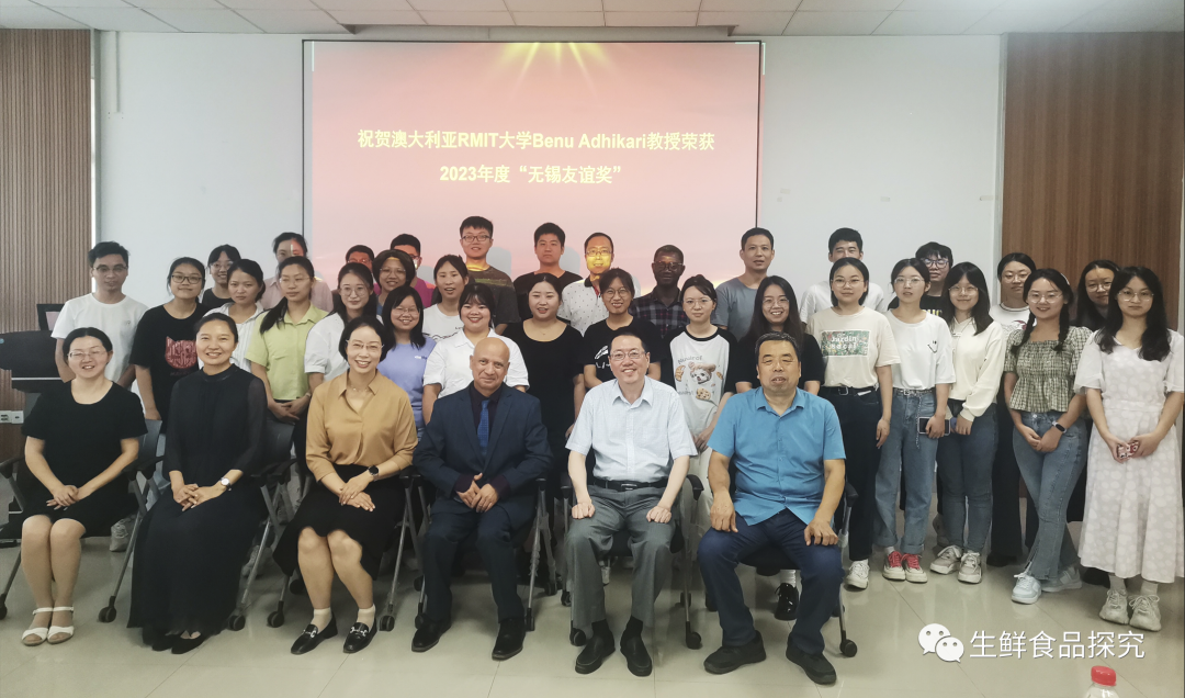 在学术报告开始之前,食品学院党委书记傅莉莉、国际交流处副处长秦洁分别对Benu Adhikari教授荣获2023年度“无锡友谊奖”表示祝贺,感谢他长期以来为江南大学和无锡企业做出的杰出贡献。Benu教授在获奖致辞中深情回顾了他在无锡轻工学院的求学时光,与江南大学和张慜教授的早期结缘时光,并表示获得此奖是和张慜老师团队长期共同努力的结果,将继续努力以产出更多的合作成果。张慜教授在致辞中对Benu教授获得“无锡友谊奖”表示热烈祝贺,并表示所率领团队富有成效的国际合作离不开学校、学院、核心外国专家、团队成员的共同努力,希望在Benu教授等专家的大力支持下把省级国际联合实验室建设好。