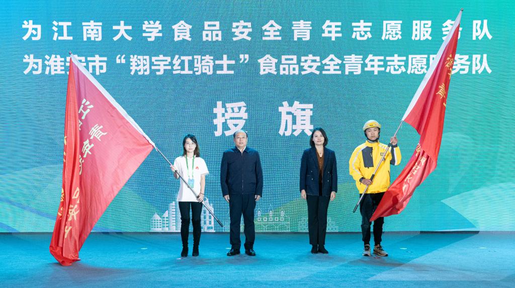 在食品安全青年志愿服务队授旗仪式环节,我校“食品安全进社区”志愿服务项目作为全省高校唯一代表入选,并上台接受省食安办副主任、省市场监管局总工程师罗雪明授旗。