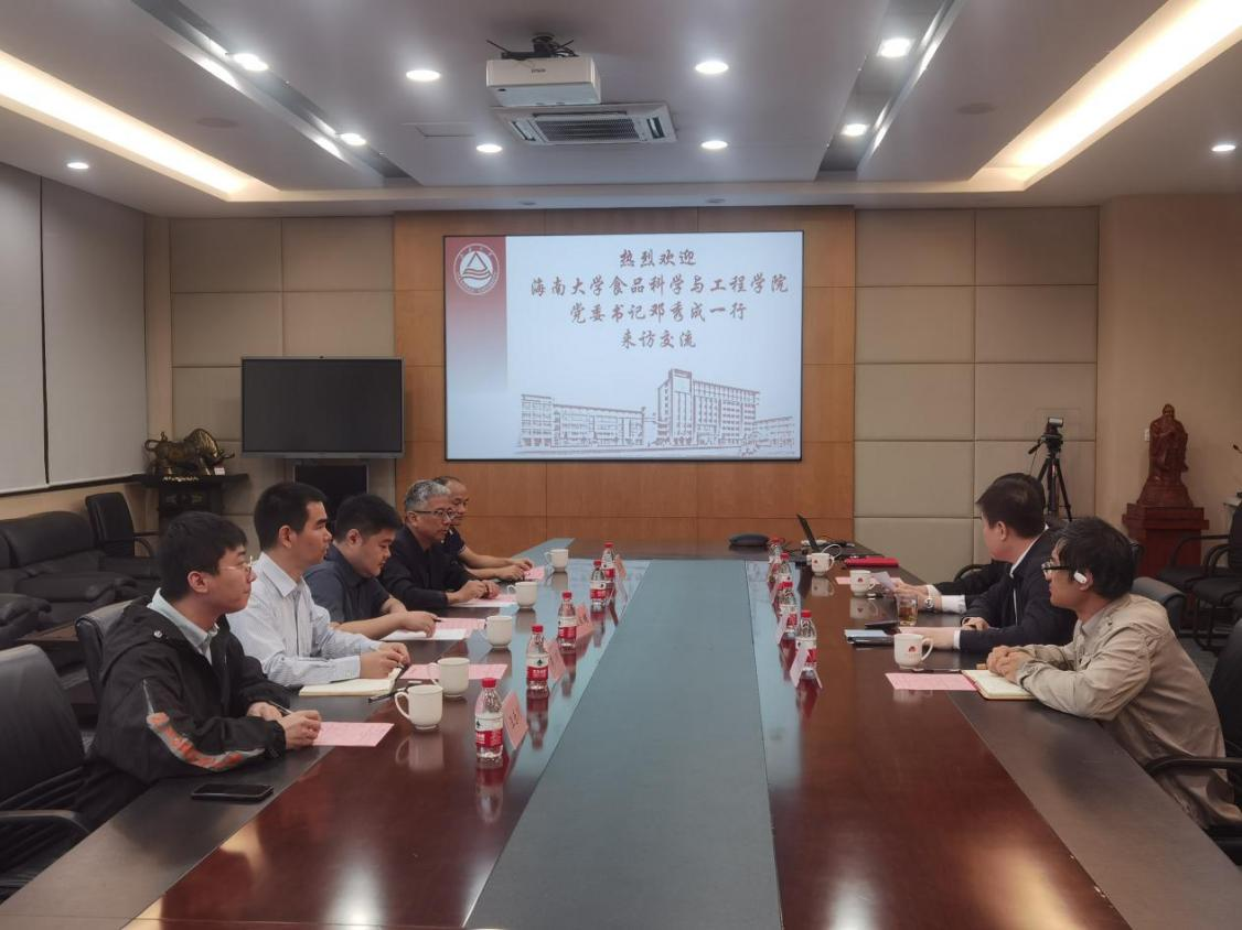 4月12日上午,海南大学食品科学与工程学院党委书记邓秀成,主持工作副院长张家超,副院长李川,副教授王露、汪乐川来食品学院交流访问。我院院长范大明,副院长翟齐啸,实验室主任王文龙,党委秘书、专职组织员朱伟接待来访。