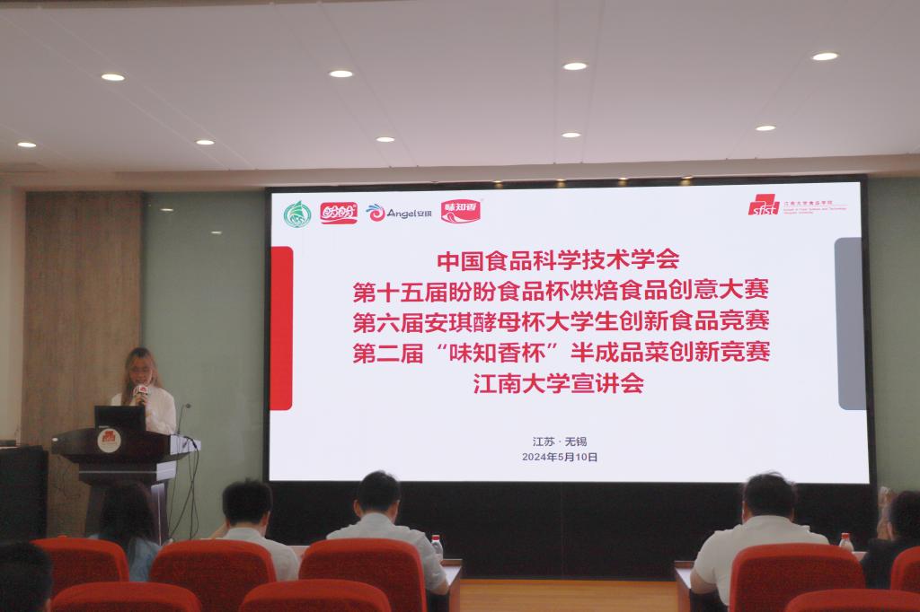 近日,第十五届“盼盼食品杯”烘培创意大赛、第六届“安琪酵母杯”大学生创新食品竞赛、第二届“味知香杯”半成品菜创新竞赛宣讲会在江南大学顺利举办。盼盼食品集团无锡区域经理刁益萍、区域主管董书芹,安琪酵母股份有限公司工程师陈颖雷、人力资源部招聘主管雷鸣,苏州市味知香食品股份有限公司招聘经理操洪涛,中国食品科学技术学会益生菌分会副秘书长、我校食品学院副院长翟齐啸,食品学院学工办主任、分团委书记李金杰,竞赛秘书叶舒迪等师生参与活动。