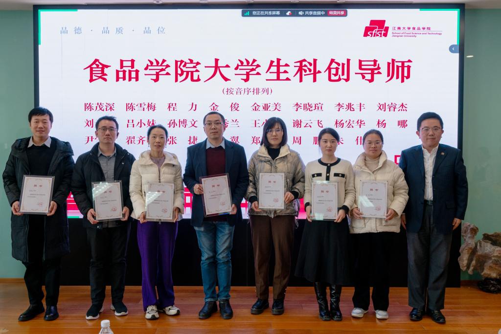 傅莉莉、张慧琪共同为江南大学大学生科创中心(食品学院)揭牌。傅莉莉宣读科创导师聘任名单。张慧琪为王鹏颁授“江南大学创新创业导师”聘书。李雷向当选为“食品学院大学生科创导师”的代表颁授聘书。