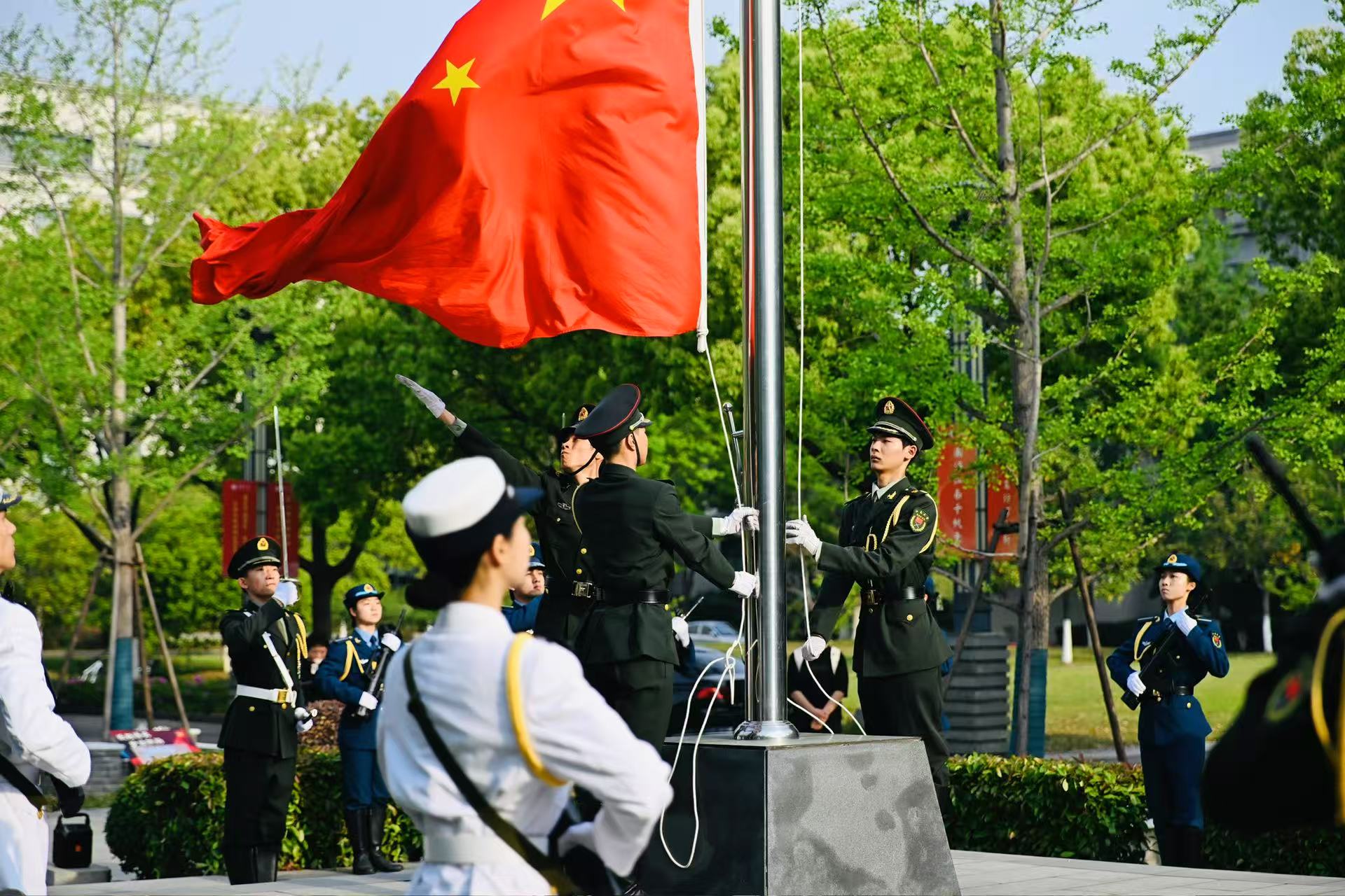 清晨7时,当义勇军进行曲铿锵有力地响起,全体师生观看了庄重肃穆的升旗仪式,鲜艳的五星红旗在空中高高飘扬,承载着历史长河里伟大祖国的浴血奋战精神与民族复兴希望。