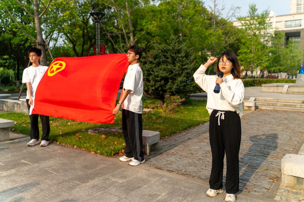 新团员入团仪式上,李金杰、胡晓丹为新团员代表佩戴团徽。食科2205皮旅特称团支部团支书安笑淋带领全体团员,庄严宣誓:“我志愿加入中国共产主义青年团,坚决拥护中国共产党的领导,遵守团的章程,执行团的决议,履行团员义务,严守团的纪律,勤奋学习,积极工作,吃苦在前,享受在后,为共产主义事业而奋斗。”铿锵有力的誓言,让团员青年们感悟入团初心与责任使命。