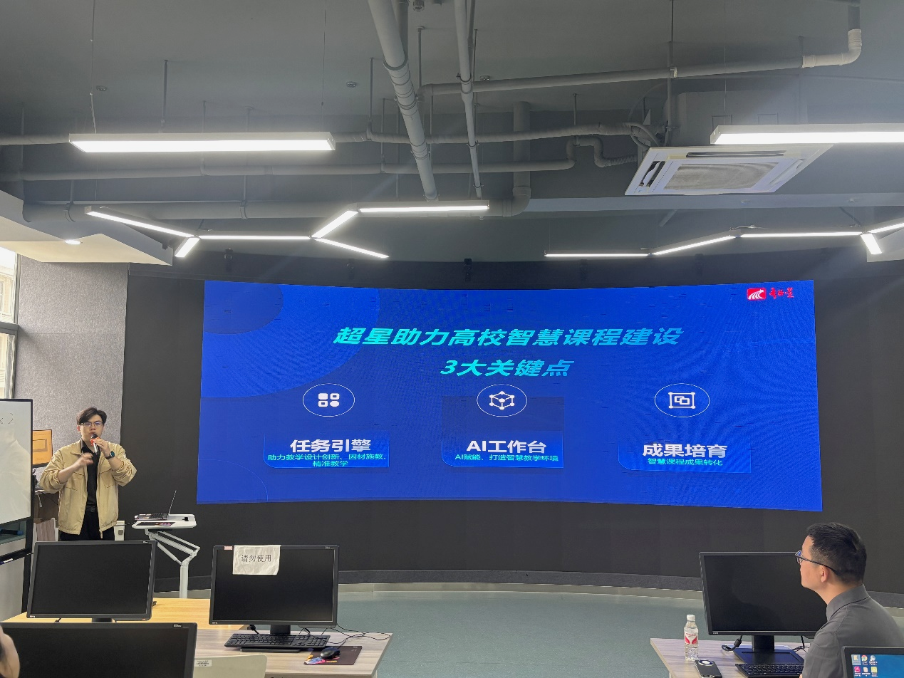 为进一步贯彻落实《中国教育现代化2035》文件精神及国家教育数字化战略部署,积极探索教学模式创新及未来教育形态变革,5月14日,食品学院在D320虚拟仿真实验室召开智慧课程建设专题研讨会。副院长常明、教学中心全体教师、教学督导代表及部分课程骨干教师参会。南京超星数图信息技术有限公司等四家国内头部智慧课程研发企业代表应邀出席会议。会议由常明主持。