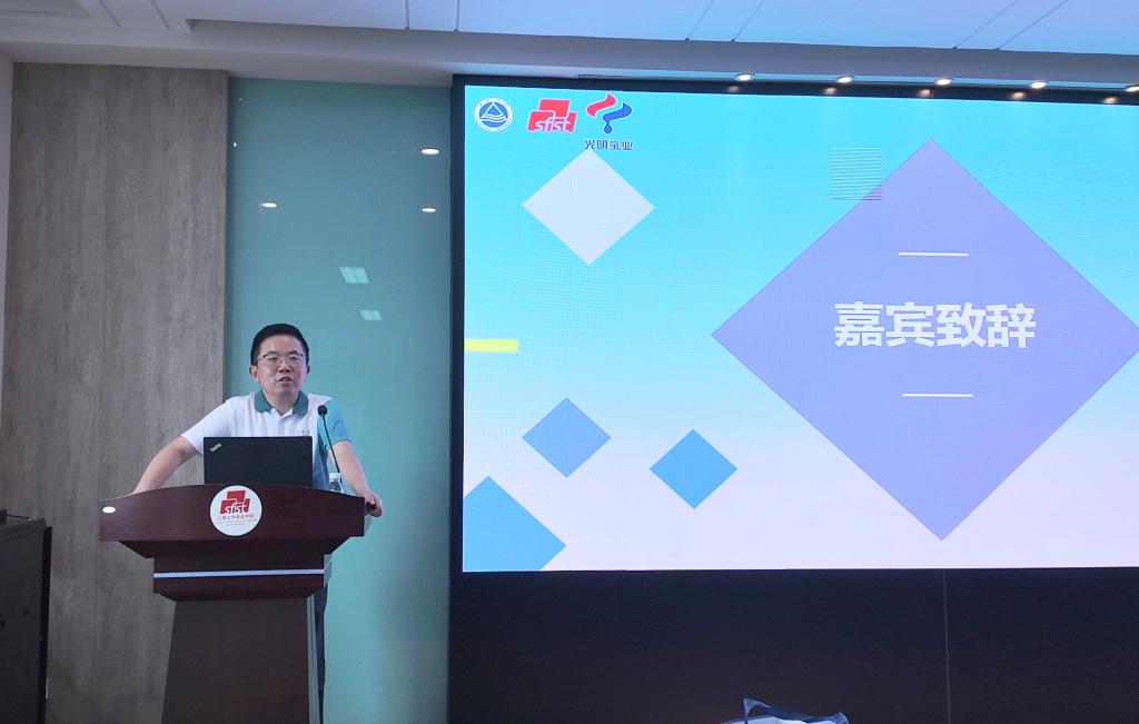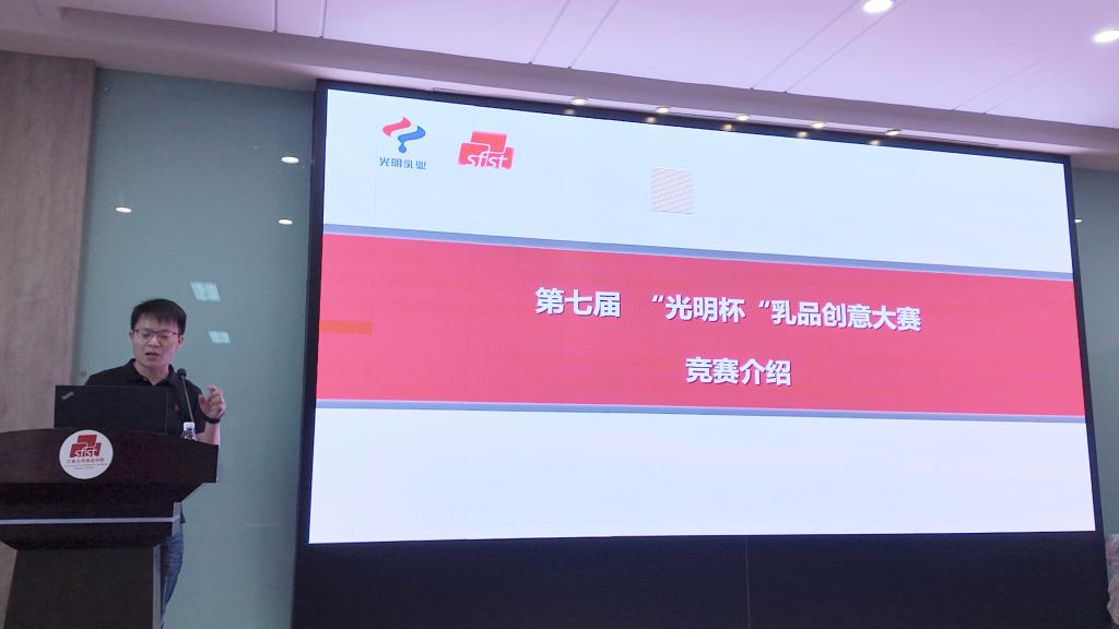 徐致远介绍光明乳业以及本届竞赛概况。他指出,消费者对食物营养和益处的关注度正持续提升,光明乳业致力于研发更优质的功能性乳品,而乳基功能配料则为功能乳品发展提供了良好基础。作为江南大学校友和在座同学们的学长,同时也是光明研发的一员,他期待大家共同努力,在本届竞赛中迸发出更多、更好的创意。