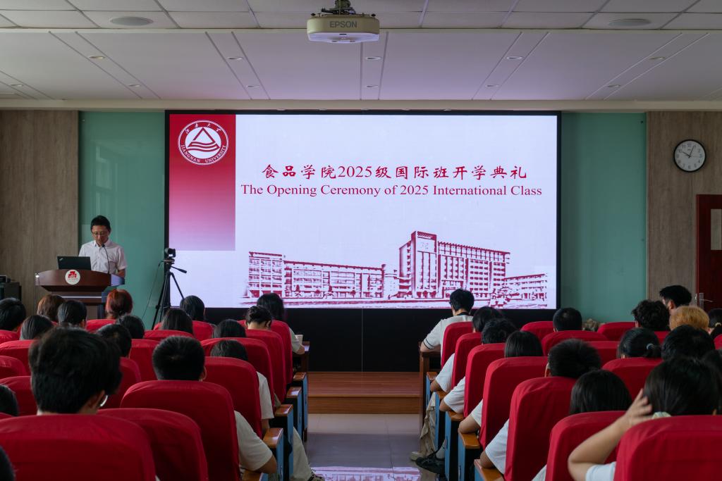 9月25日上午,江南大学与梅西大学食品科学与工程专业本科中外合作办学项目2025级新生开学典礼在食品学院D912报告厅隆重举行。梅西大学食品及自然科学学院院长Jamie Quinton等在线出席,梅西大学副教授Sabrina Tian,江南大学国际交流合作处处长倪晔,食品学院党委书记傅莉莉,院长孙秀兰,副书记、副院长陈勇,教师代表及全体60名新生等参加典礼。典礼由陈勇主持。