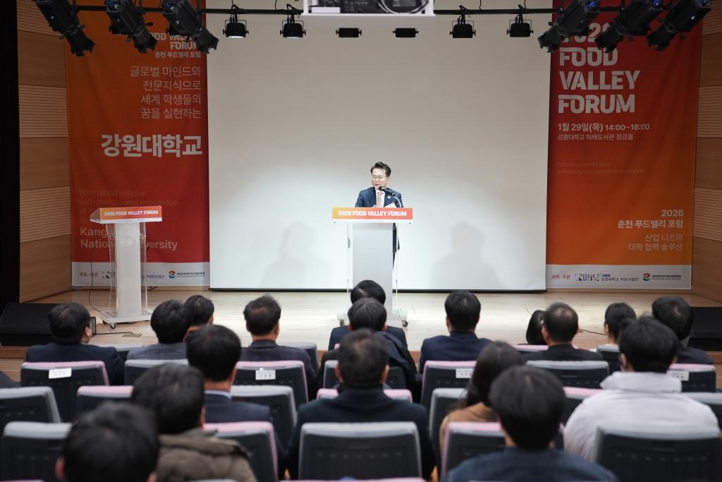 1月29日下午,代表团出席了“食品科技论坛”。在开幕环节,春川市市长在致辞中回顾了去年10月访问无锡的经历,对中国的发展成就表示高度赞赏。他指出,食品科技是春川市的四大支柱产业之一,市政府将大力支持江南大学与江原国立大学之间的合作,积极推动双方在知识共享与产业联动方面的深度交流。无锡市与春川市已于2025年10月正式缔结为友好交流城市,为两校合作提供了坚实的区域协作基础。江原国立大学校长也共同表达了对代表团此次访问的欢迎与对合作前景的积极期待。