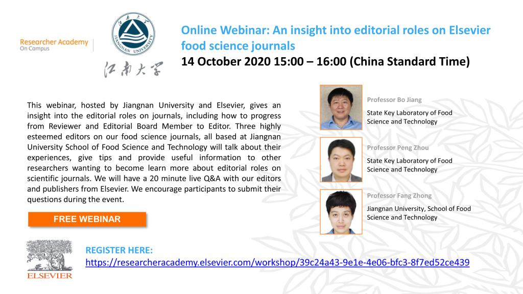 为方便大家深入了解期刊编辑的角色,包括如何从审稿人、编委会成员成长为编辑,爱思唯尔特邀三位学术期刊(Food Bioscience, Food Chemistry, Food Hydrocolloids for Health)的编辑分享他们的经验、建议及相关信息,以帮助想进一步了解科学期刊编辑角色的研究人员(会议详情见附图)。本次网络研讨会由江南大学和爱思唯尔共同主办,具体通知如下:
