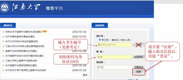 通过申请考核考生登录“江南大学网上缴费平台” (网址:http://pay.jiangnan.edu.cn/payment/)。
