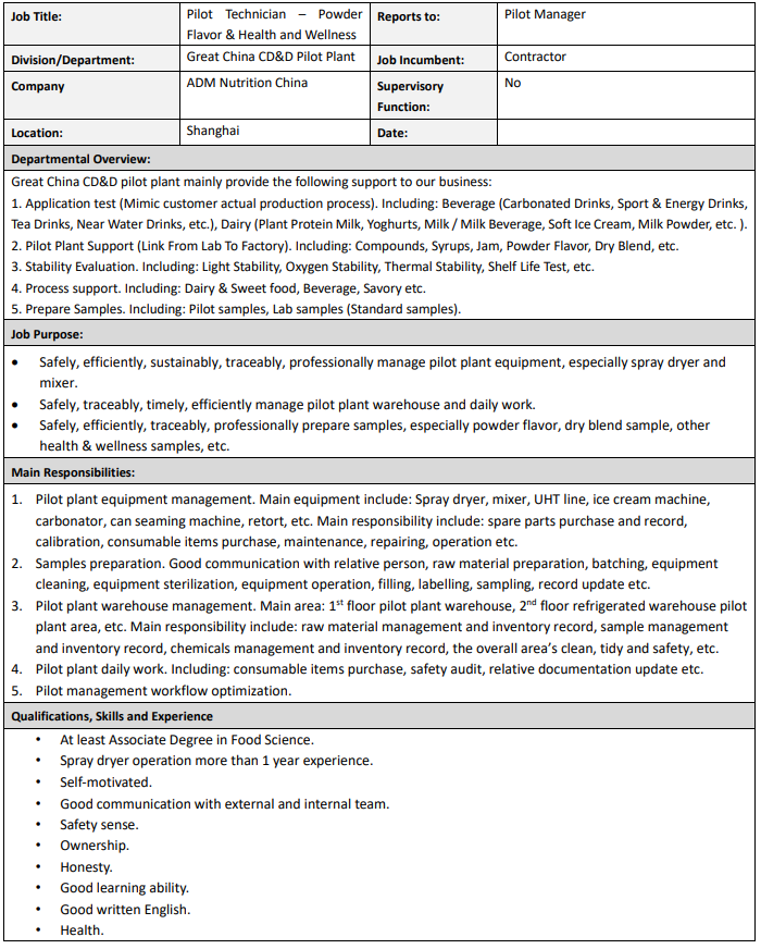 就业【2022】 7号 Pilot Technician – Powder Flavor & Health and Wellness