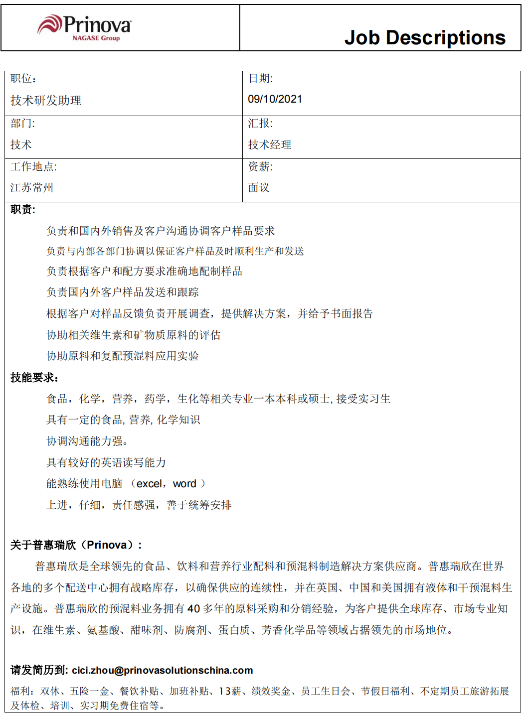 就业 【2022】 15号 普惠瑞欣(常州)营养科技有限公司招聘简章