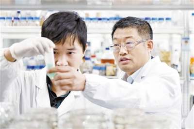 中国工程院院士、江南大学教授陈卫(右)在实验室