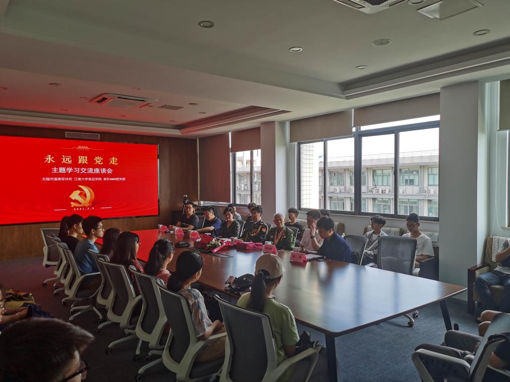 为强化革命精神传承,近日,食品学院联合无锡市溪南军休所在食品楼D925开展“永远跟党走”主题学习交流座谈会。原总装备部工程兵技术装备研究所政治部主任梅金超,原第101医院副政委董振泰,无锡市溪南军休所副所长、关工委副主任陈鸣辉,无锡市溪南军休所办公室主任、关工委成员林世琳,食品学院党委副书记、副院长魏珍吉,食品学院分团委书记朱伟以及食科2009团支部全体成员参加了活动。