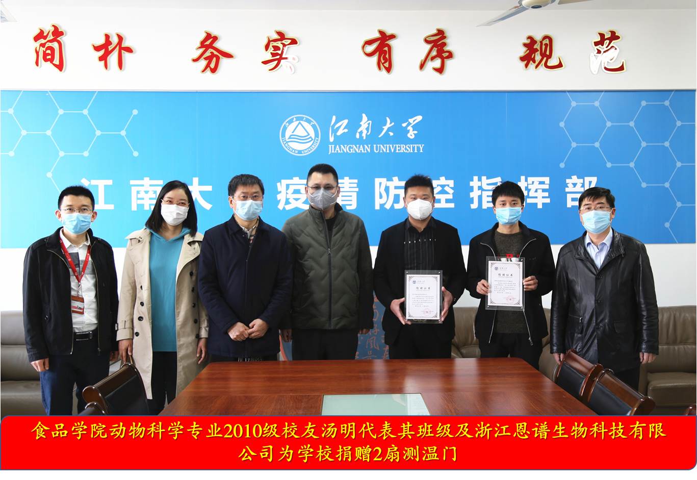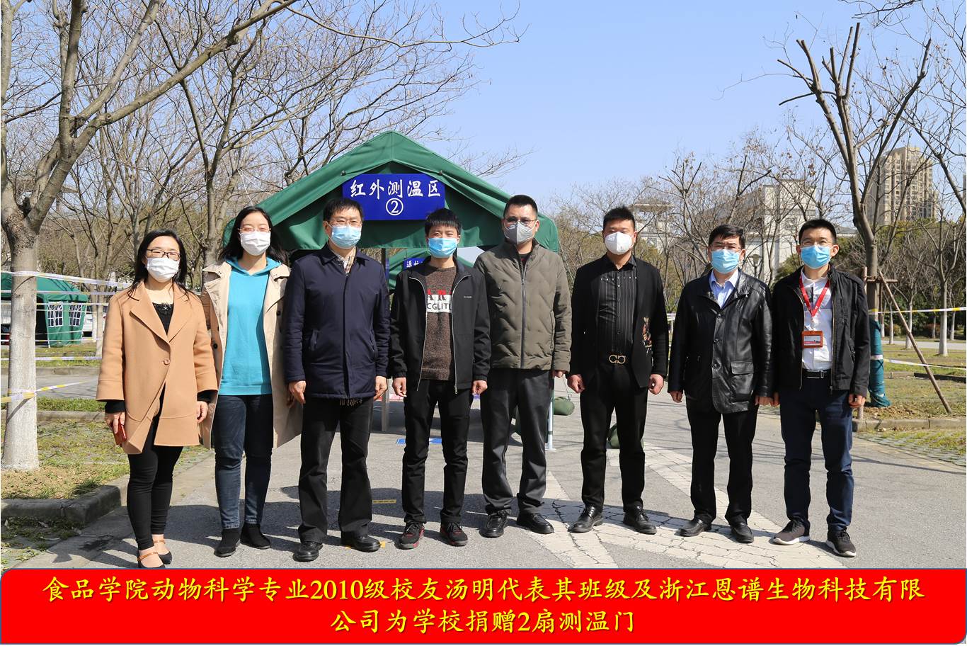 3月20日上午食品学院校友汤明专程赶到学校,分别代表其作为法人的浙江恩谱生物科技有限公司和在校时的食品学院动物科学专业2010级向学校捐赠了两套红外热成像人体测温门。田备副校长代表学校接受捐赠,社会资源处处长黄敏,食品学院党委书记傅莉莉、院长刘元法等出席捐赠仪式。