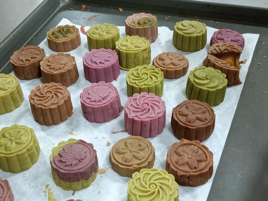 随后,进入烘焙环节,现场同学分为两组,在烘焙俱乐部成员指导下进行面点制作和烘焙,一组制作戚风蛋糕,一组制作桃山皮月饼,中西点心碰撞,趣味性十足。在制作过程中,中国学生热情、耐心地讲解制作细节,留学生们认真学习,展示出了独特的烘焙天赋。在欢声笑语中,桃山皮月饼和戚风蛋糕前期准备完成,进入了烘烤阶段。