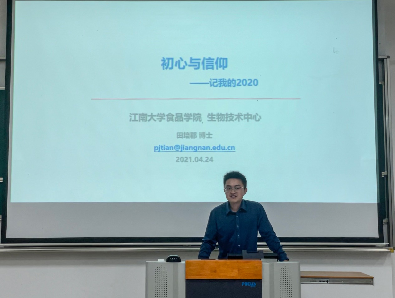 在中国共产党建党100周年之际,为进一步深化学生对党的性质宗旨的认识,提高学生的思想政治觉悟,4月24日晚,食品学院在教学楼2A127举办了“喜迎建党100周年,分享初心故事”主题活动。食品学院生物技术中心博士后田培郡、食硕2005党支部书记孙彦文受邀担任主讲,食品学院2020级全体本科生参加了本次活动。