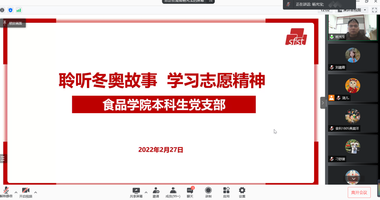 2月27日下午,食品学院本科生党支部开展“聆听冬奥故事,学习志愿精神”党课活动。活动由辅导员杨光宝主持,冬奥会志愿者杜佳欣同志应邀进行志愿经历分享。