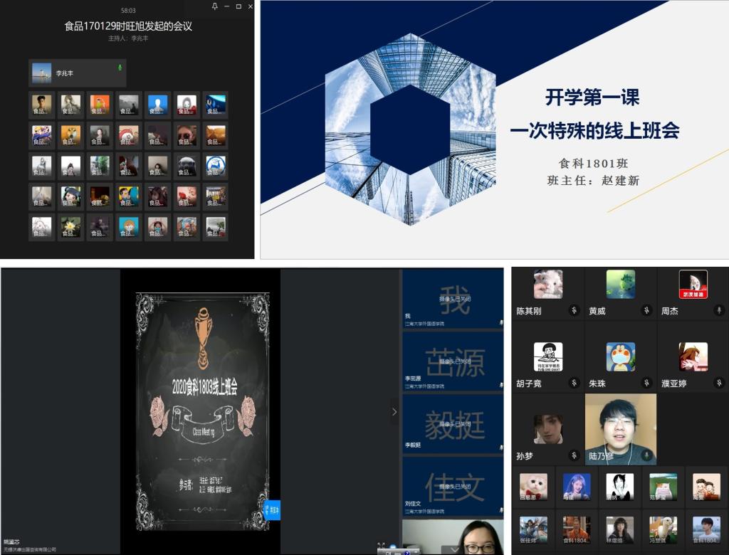 据了解,食品学院2020年春季学期34个教学班级课程已全部正式上线。课程将采用直播、录播、视频会议等多种网络教学模式如期开展。39名专任教师也早已在居家办公的条件下,完成了紧张的教学准备,运用“学习通”“企业微信”“钉钉”等app开展课堂直播、交流互动、作业布置批阅等教学活动。全体班主任提前一天在线召开班会,关心慰问学生,对在线课堂纪律和居家学习生活提出要求和建议,营造新学期仪式感。各党、团支部还号召同学们针对“疫情见闻”写一份特殊的思想汇报。