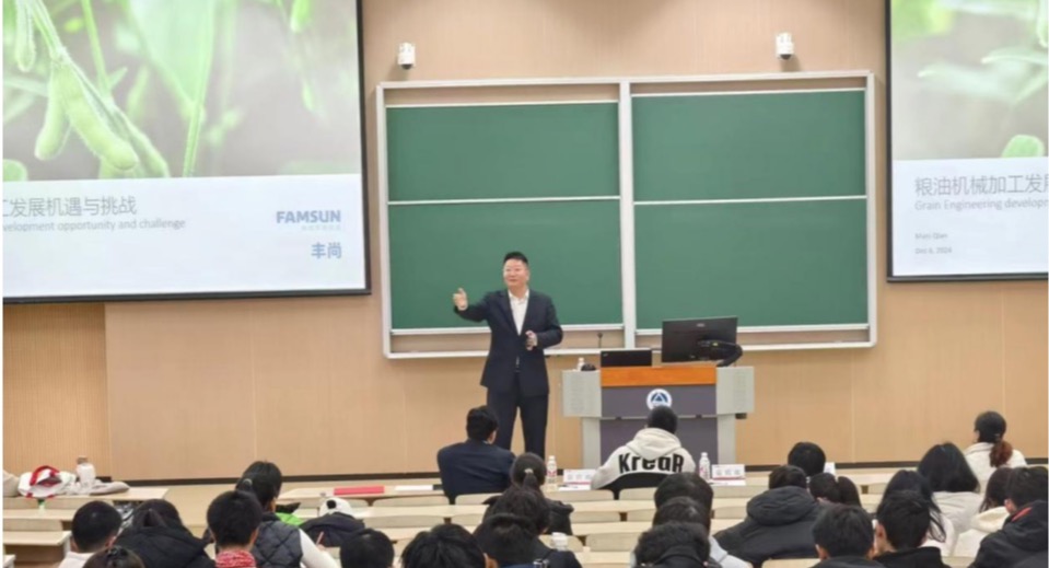 课上,钱胜峰用详实的数据和辩证的眼光,以全球油料作物产量和植物油产量与消耗作为开端,对全球油脂设备进出口数据与行业发展趋势进行详细剖析,指出粮油机械加工技术瓶颈和创新方向,并对行业未来发展予以前瞻。他呼吁同学们立足当下,学好基本功,投身多产业联合,提高核心竞争力。“希望同学们共同行动起来,未来选择粮油产业,加入包括丰尚在内的民族企业去发挥光和热”,钱胜峰老师如是说。