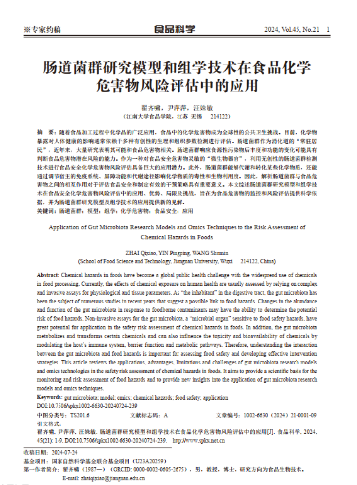 近日,我校食品学院翟齐啸教授受邀在《食品科学》杂志发表题为《肠道菌群研究模型和组学技术在食品化学危害物风险评估中的应用》的学术综述。该篇综述内容基于翟齐啸此前出席联合国粮食及农业组织(FAO)在意大利罗马举办的“食品安全化学风险评估中的肠道微生物组”技术会议时的报告内容。